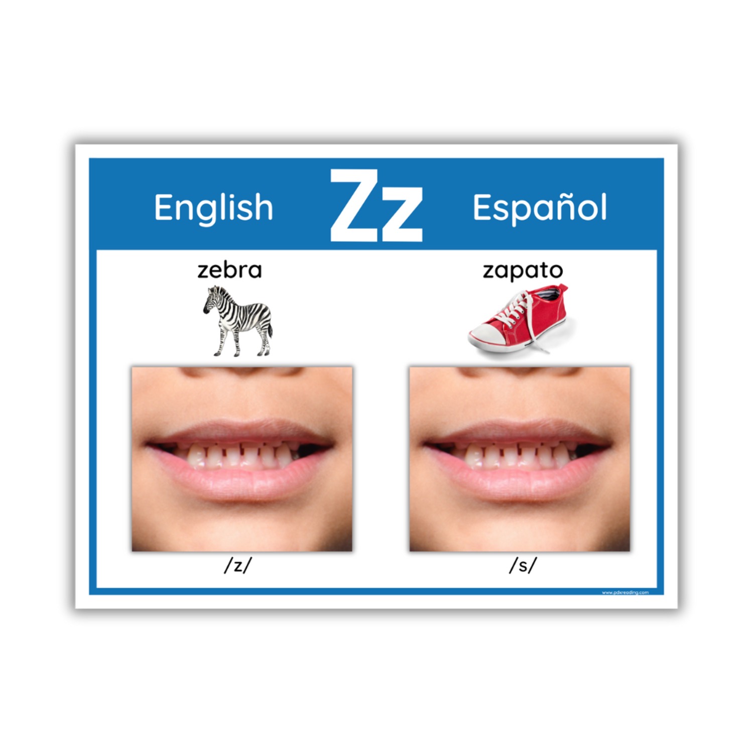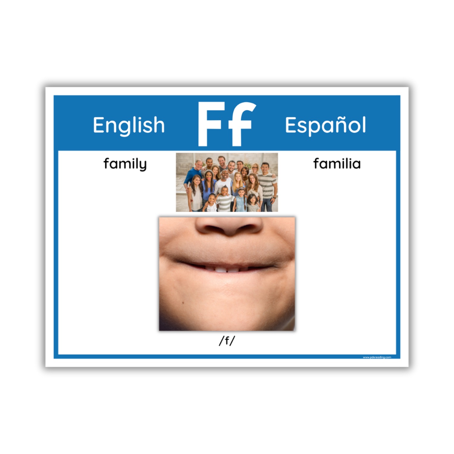 When teaching, highlight similarities and differences between the English and Spanish alphabets, phonemes, and graphemes. Use the mouth position images to model accurate articulation and help students make cross-linguistic connections.