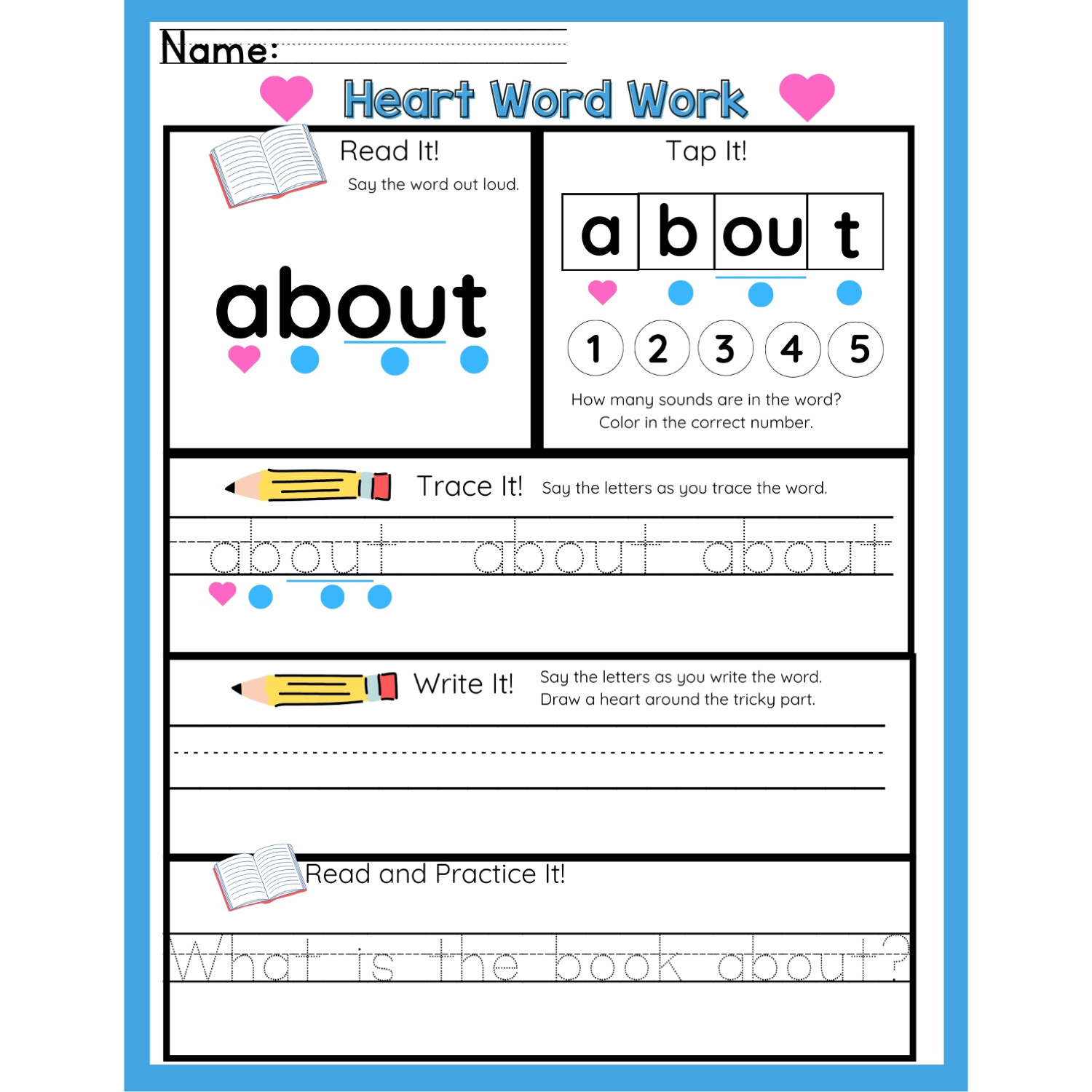 • Workbook Pages Included: 150 page printable color workbook that includes a practice sheet for each word in the heart word deck and two additional blank pages to write in other heart words.