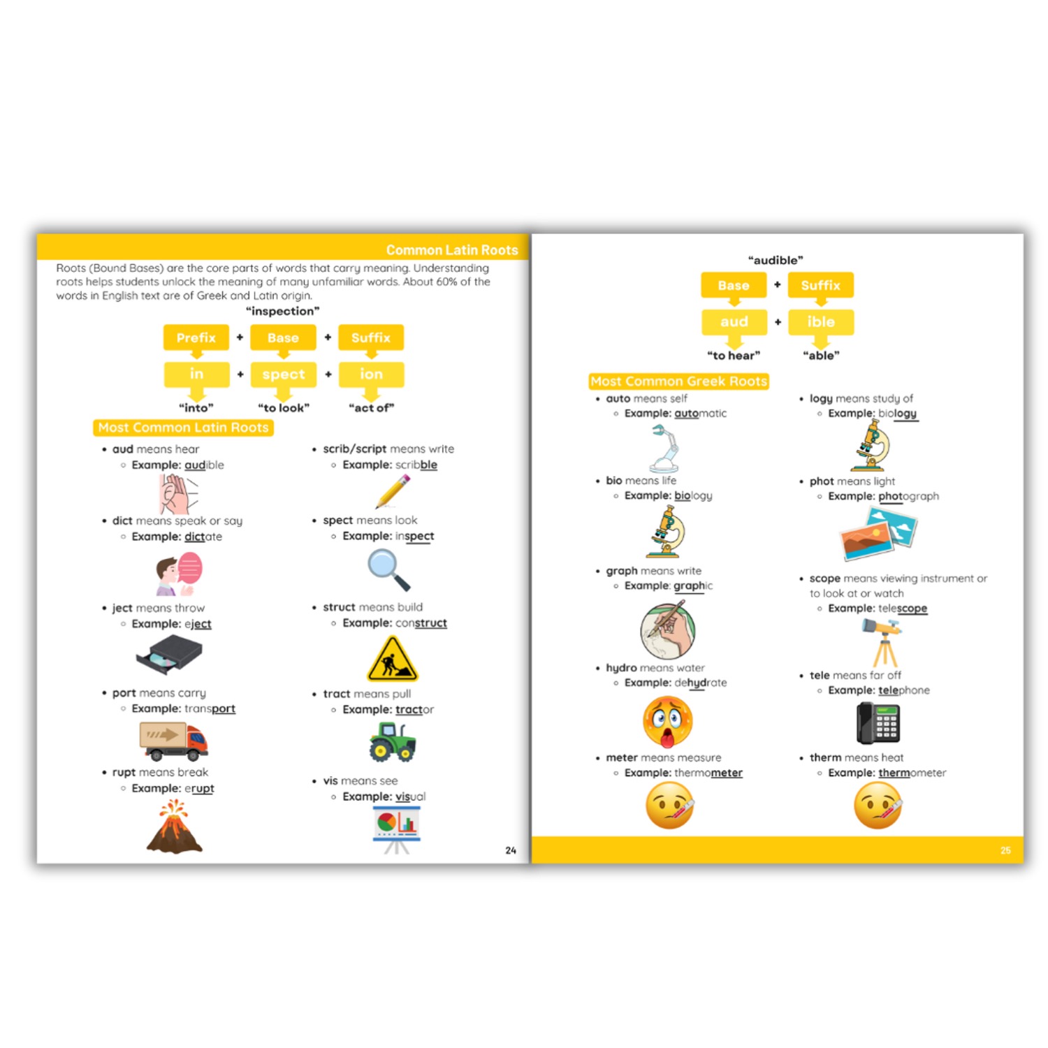 - Morphology essentials: affixes, common prefixes, suffixes, and frequently used Greek and Latin roots (bound bases)