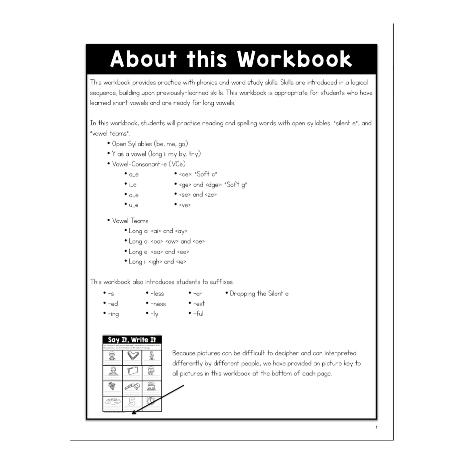 This workbook provides practice with phonics and word study skills. Skills are introduced in a logical sequence, building upon previously learned skills. This workbook is appropriate for students who have learned short vowels and are ready for long vowels.